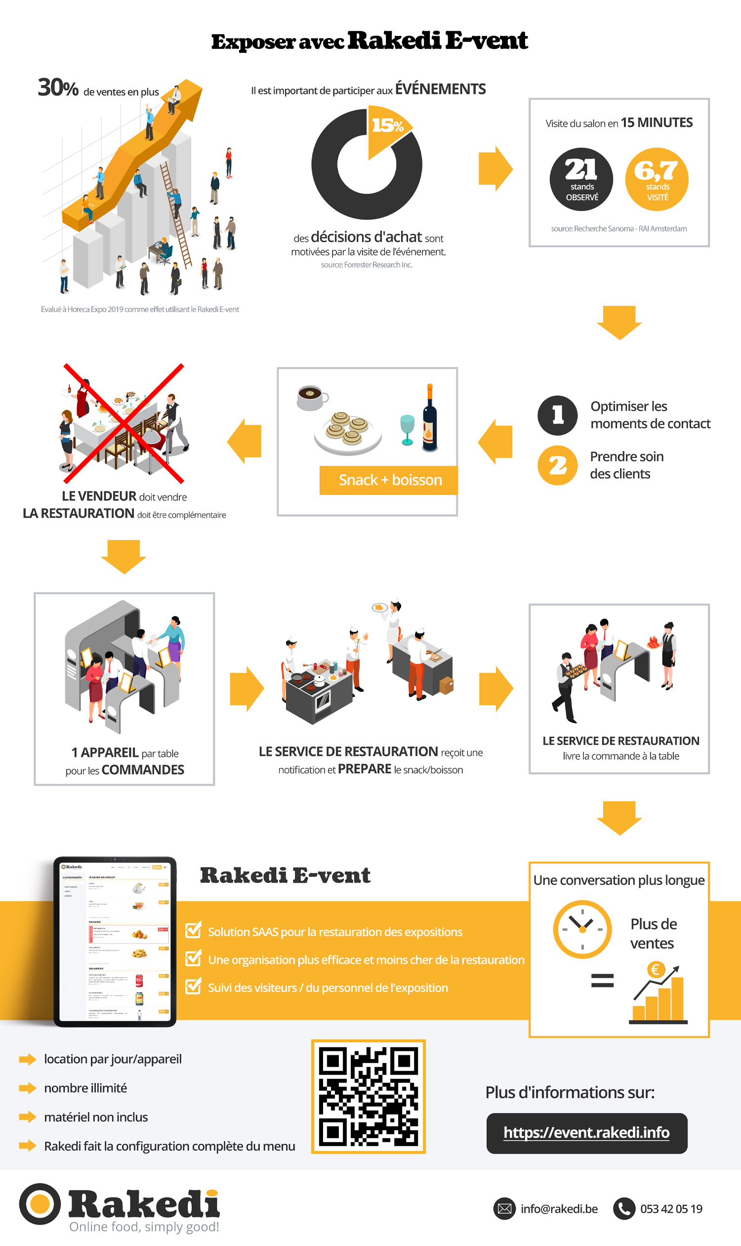 La célèbre application de commande de nourriture en ligne Rakedi a été conçue pour être utilisée lors de salon et d'événements où les visiteurs peuvent se procurer une boisson et/ou à manger. Les vendeurs peuvent désormais passer plus de temps avec les visiteurs car le service de restauration du salon professionnel ou de l'événement reçoit les commandes par le smartphone ou l'iPad du vendeur.